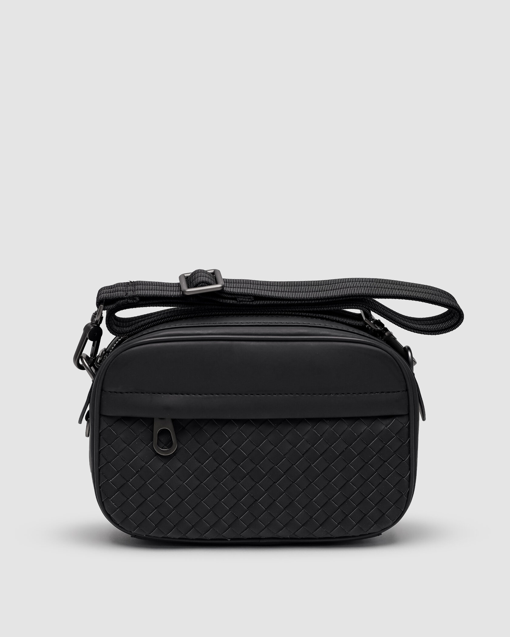 Розмір 22.5x15x5.5смСумка виготовлена з плетеної матової шкіри.Всередині одне відділення, також є кишеня на застібці.На лицьовій стороні є додаткова кишеня.Підкладка у сумки з оксамитового текстилю.Фурнітура металева, не брендована.Ремінець з щільного текстилю чорного кольору, на карабінах, має регулюєму довжину.Комплектується в брендову коробку та пильовик