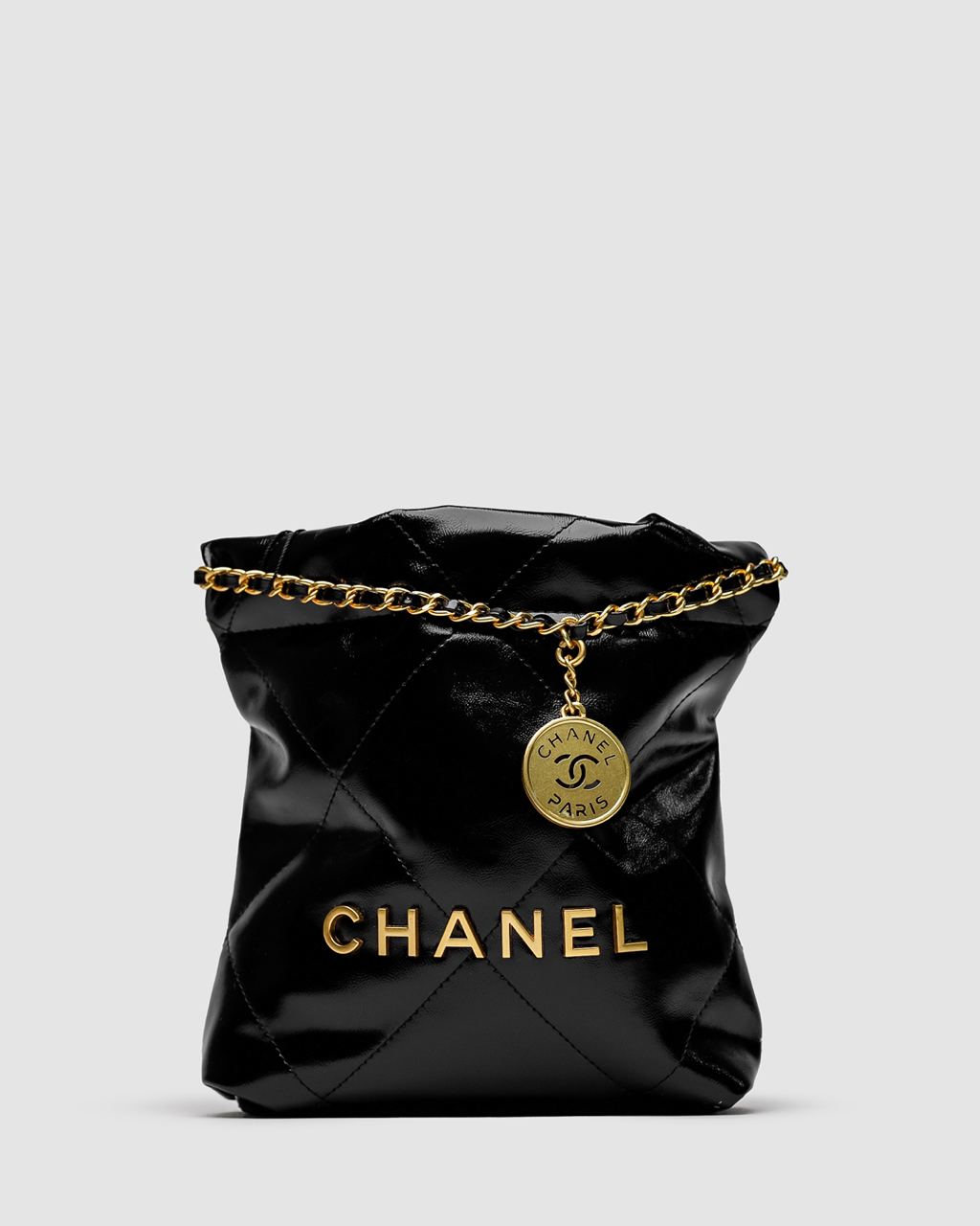 Розмір 23х22х6смСумка виготовлена з лакованої гладкої шкіри з простроченням.Всередині одне велике відділення, також є кишеня з маркуванням.Підкладка з щільного текстилю з ромбоподібним простроченням.Зачиняється завдяки стягування ланцюжка.Для носіння у руці та через плече є ланцюжок з вплетеною шкірою.Комплектується в брендовій коробці та пильовику, також в комплекті є картка, буклети та подарункова стрічка.