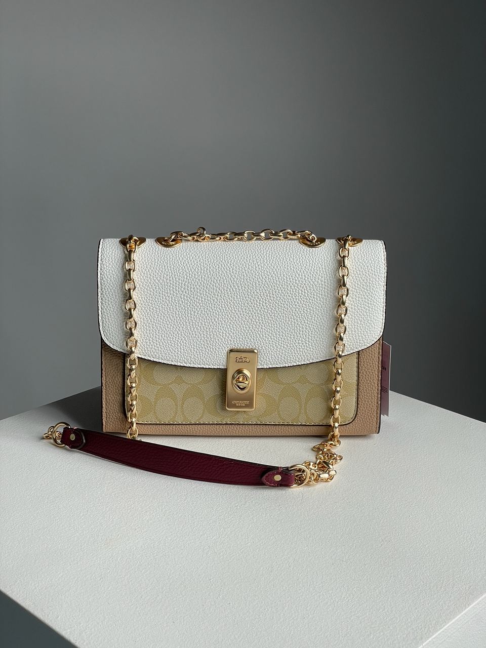 Розмір 25.5x17x9смСумка виготовлена з якісної шкіри з фірмовою канвою.Усередині 2 відкритих відділення, одне на застібці та дві кишені.Підкладка всередині текстильна, приємна на дотик.Фурнітура дуже якісна, металева та брендована.Золотистий ланцюжок регулюється як для носіння через плече так і у руці, ручка з натуральної шкіри.Комплектується у брендованій коробці на магнітах та пильовику, також є брендовий пакетик, бірки, стрічка на подарунок.