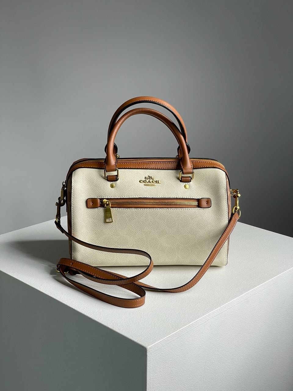 Розмір 26x16x14смСумка виготовлена з якісної шкіри з фірмовою канвою.Має одне велике та одне маленьке відділення на застібці, також всередині є кишеня.Підкладка всередині з щільного та якісного текстилю.Фурнітура дуже якісна, металева та брендована.Вузький шкіряний ремінець на карабінах для носіння через плече має регульовану довжину.
