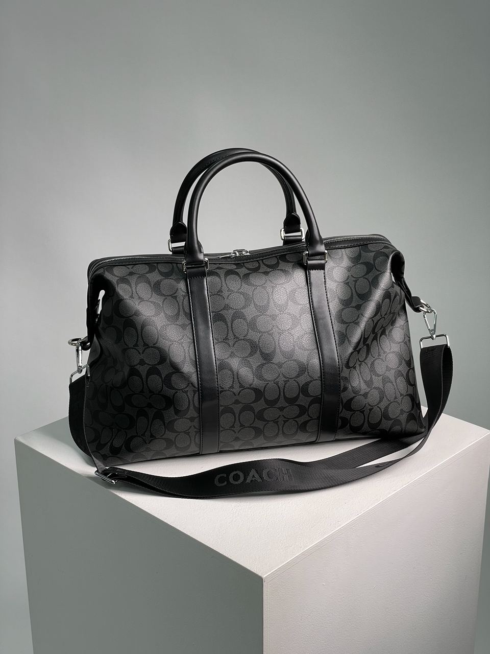 Розмір 45х27х18смСумка виготовлена з гладкої шкіри в фірмовій канві.Всередині одне велике відділення, також є три кишені, одна з яких на застібці.Підкладка з щільного текстилю чорного кольору.Фурнітура дуже якісна, металева та брендована.Текстильний ремінець на карабінах має можливість регулюватись по довжині.