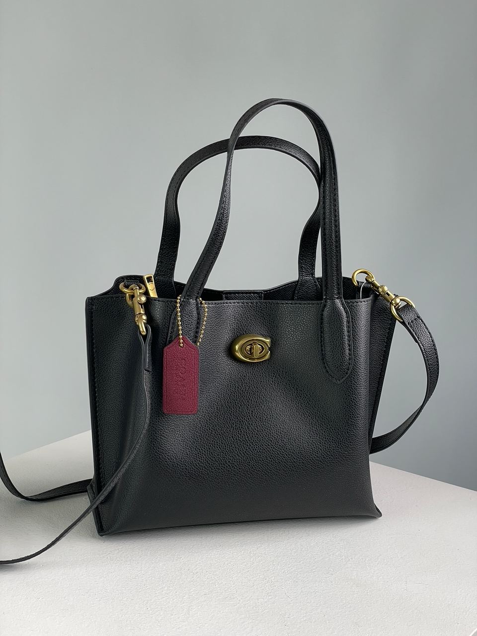 Розмір 25x18x10смСумка виготовлена з гладкої шкіри.Усередині два великих відділення, також є відділення на застібці.Підкладка всередині шкіряна (як і зовні сумки).Одне відділення зачиняється на магніті, інше на пімпочці у букві C.Якісна металева фурнітура, брендована.Маються ручки для носіння у руці та додатковий вузький ремінець на карабінах для носіння через плече (регулюється по довжині).Комплектується у брендованій коробці та пильовику.