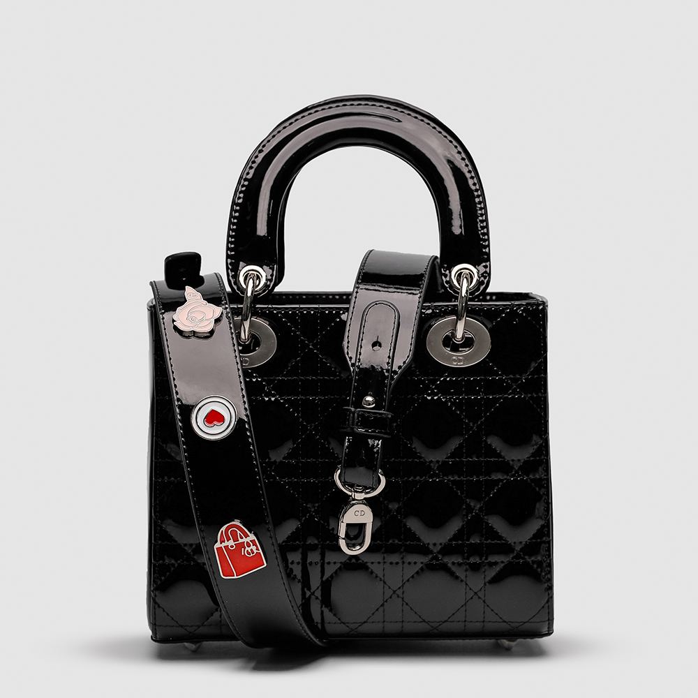 Розмір 20х17х9смСумка виконана з лакованої шкіри, прострочена в фірмовому стилі.Всередині одне відділення, також є кишеня на блискавці з фірмовою нашивкою.Закривається відділення завдяки «капюшону» котрий його накриває.Підкладка з приємного на дотик оксамитового текстилю.Фурнітура металева та брендована.Шкіряний ремінець для носіння через плече фіксованої довжини, має металеві різнокольорові піни.Комплектується в брендову коробку на магнітах та пильовик, є буклети та хустинка.