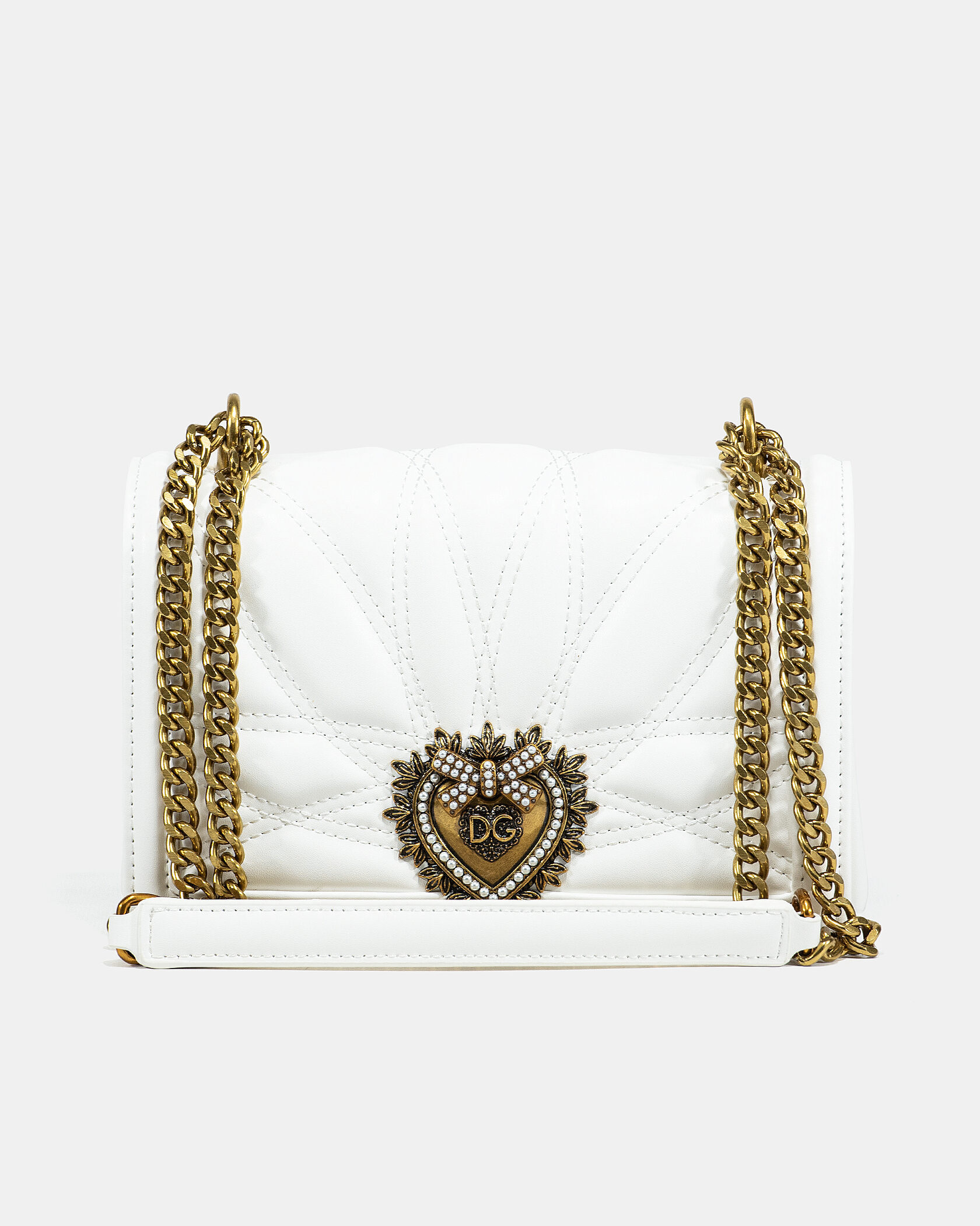 Розмір 21x13x7смМатеріал: ШкіраФурнітура: ЗолотаОсобливості: Вишукана сумка Devotion з культовим серцем DG, виконана в елегантному білому кольорі з ланцюжковим ремінцем — стильний акцент до будь-якого образу.