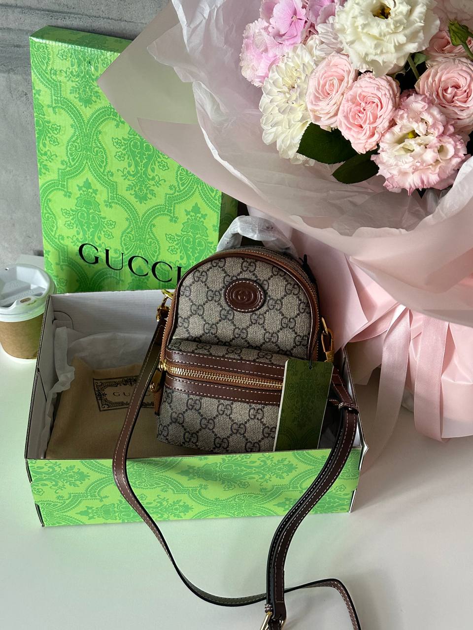 Розмір 18х14х10 смМатеріал: Шкіра, текстильДва відділи, маленька кишеняЛого всерединіВ комплекті: коробка Gucci , пакувальний папір, пильник фірмовий