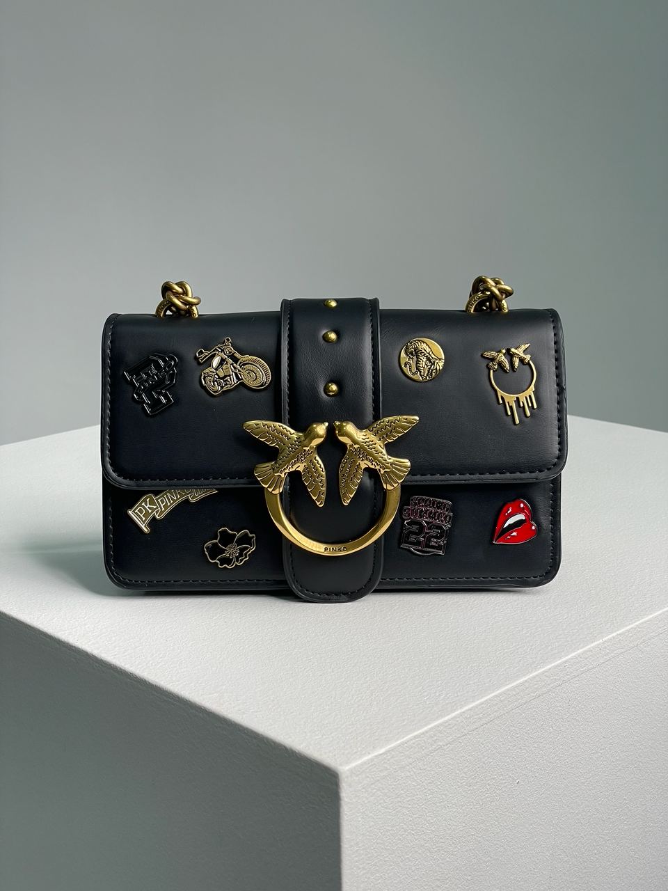 Розмір 21х12х7смСумка виготовлена з гладкої шкіри з металевими пінами.Попереду фірмовий логотип за яким ховається замочок.Всередині два відділення, поміж ними є кишеня на застібці.Підкладка у сумки з приємного на дотик текстилю.Фурнітура металева, брендована.Для носіння через плече є золотистий ланцюжок з шкіряною ручкою.Комплектується у фірмовій коробці та пильовику.