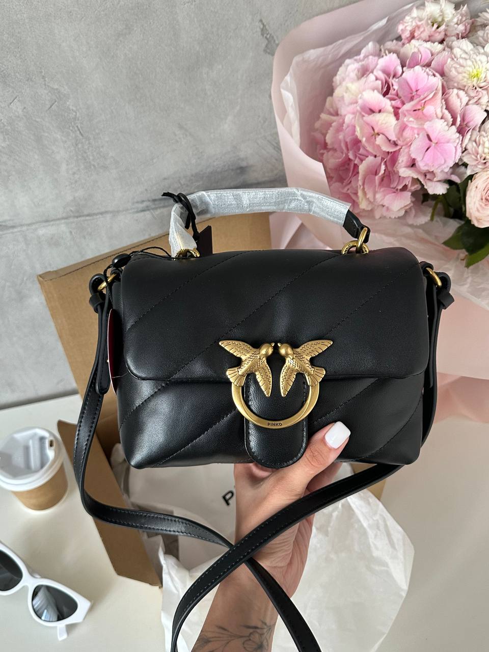 Розмір 21х12х7 смМатеріал: шкіраДва відділи, маленька кишеня, кишеня на блискавці Ремінець 90 смЛого всередині, сердечко з qr-кодом, бірочки В комплекті: коробка Pinko , пакувальний папір, пильник фірмовий