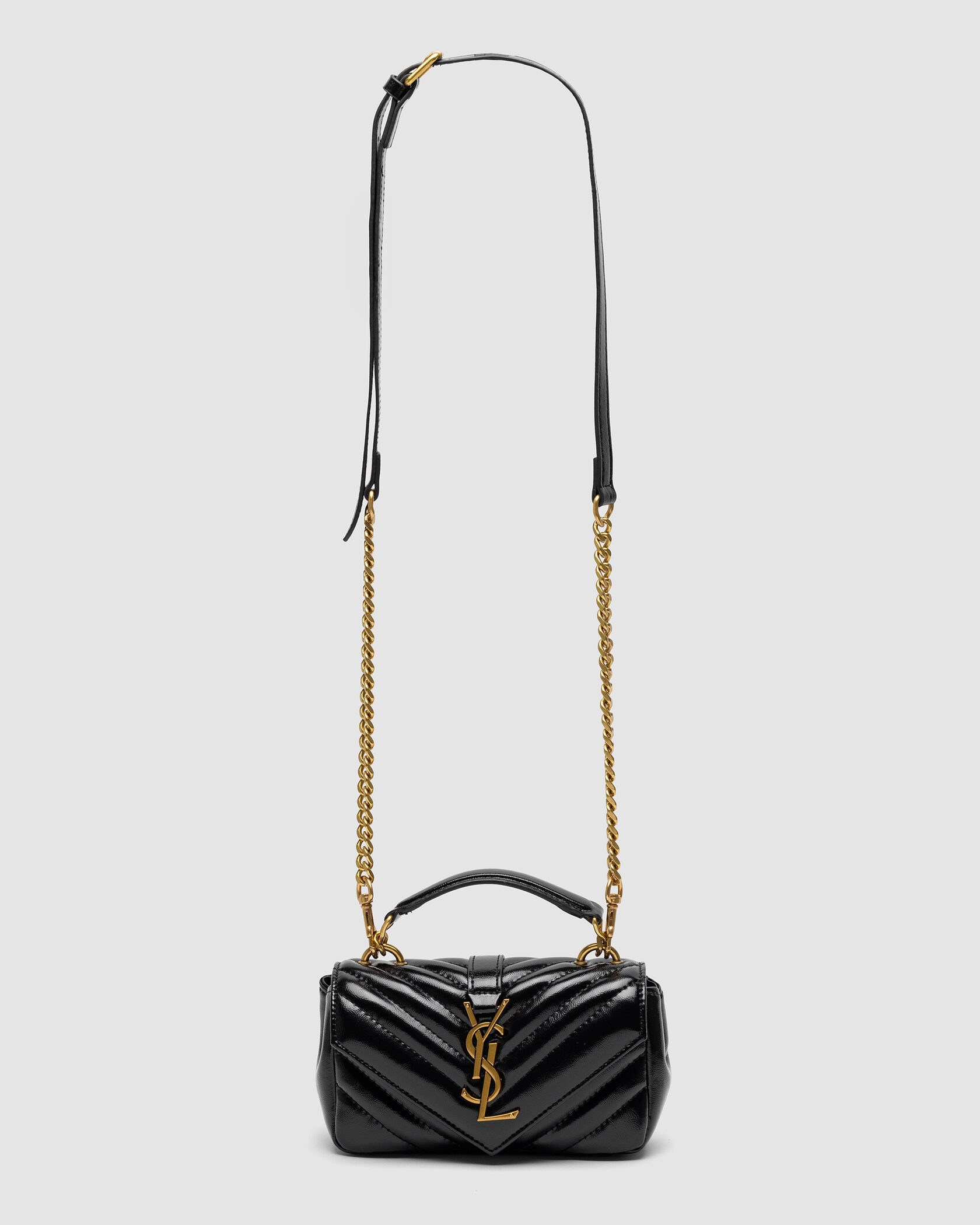Розмір 20х10х5смСумка виготовлена з гладкої лакованої шкіри, прострочена.Всередині одне відділення, є невеличка шкіряна кишеня.Підкладка виконана з щільного ребристого текстилю.Зачиняється відділення на магніті-клапані.Фурнітура металева, брендована.Ланцюжок на карабінах, має шкіряну ручку з регулюємою довжиною.Комплектується у брендовій коробці на магнітах та пильовику, є буклети.