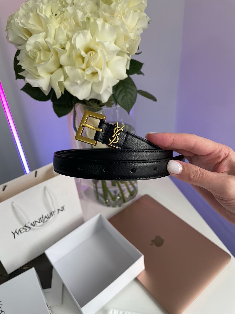 Розмір 100х2смРемінець виконаний з гладкої шкіри.Металева бляха під золото.Є можливість зробити додаткові отвори під необхідний розмір.Комплектується у брендовій коробці Yves Saint Laurent та пильовику, є пакетик та картка.