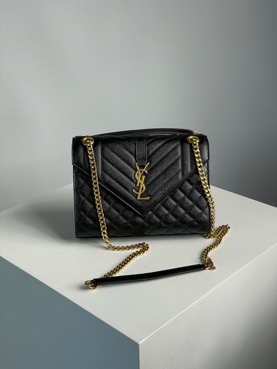 Розмір 24х18х7смСумка виготовлена з зернистої шкіри, прострочена.Всередині одне відділення, також є кишеня з шкіряною нашивкою.Підкладка у сумки з щільного ребристого текстилю.Зачиняється відділення на магніті-клапані.Якісна фурнітура, металева та брендована.Ланцюжок фіксованої довжини, може регулюватись як для носіння у руці, так і через плече.Комплектується в брендованій коробці та пильовику, є буклетик.